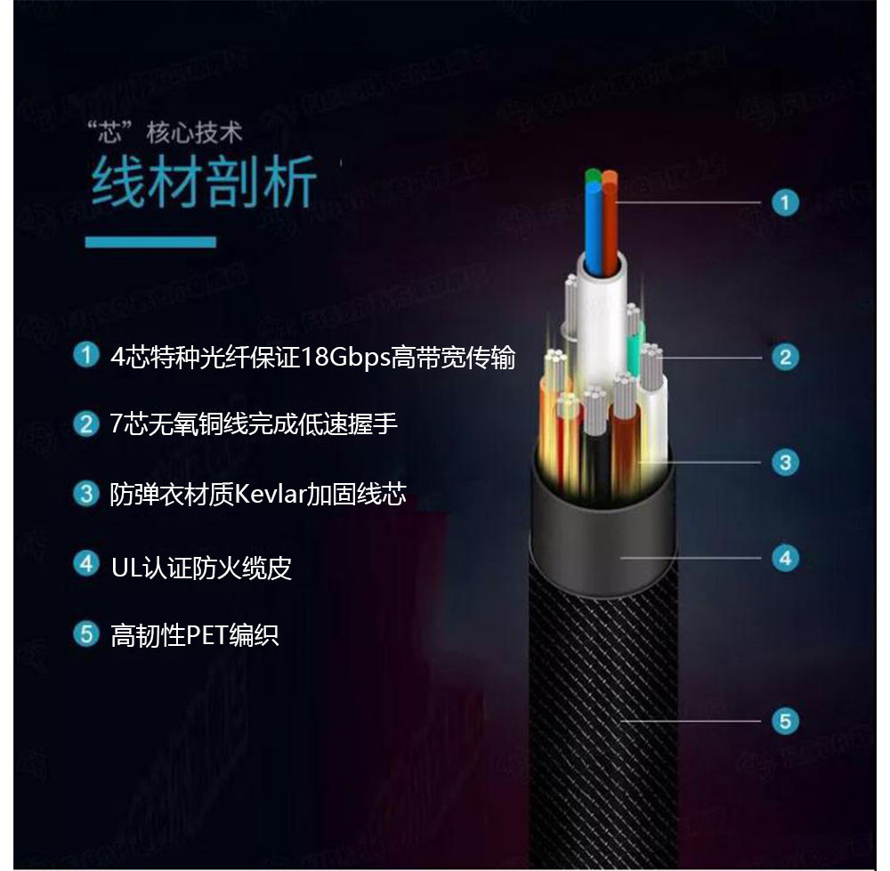 | 光纖內芯+專業光電轉換芯片,18Gbps高帶寬傳輸,視頻信號高速穩定,不卡頓不掉幀 |