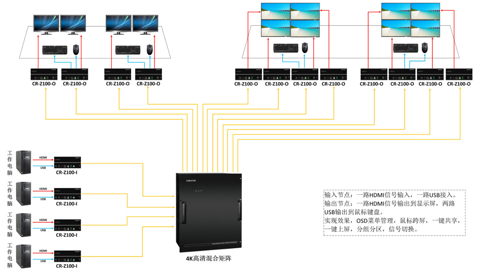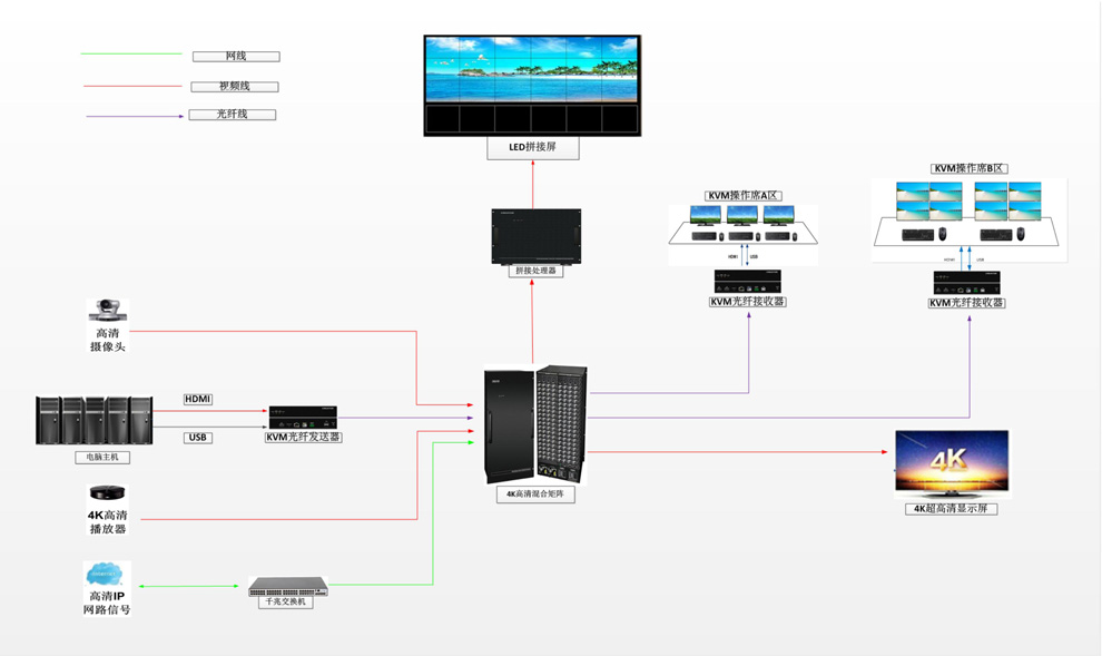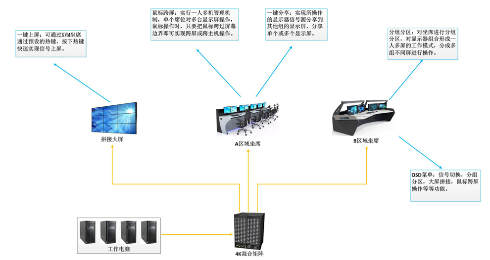 該項目建設應急指揮中心,涉及音視頻切換,KVM坐席管理,大屏拼接等。